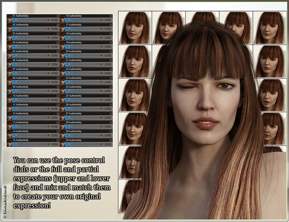 Authenticity is a set of high quality expressions for Genevieve 7 and Genesis 3 Female(s). For each expression you have 4 ways to use it: one click presets for full face expressions, upper face partial expressions, lower face partial expressions, and pose control dials.