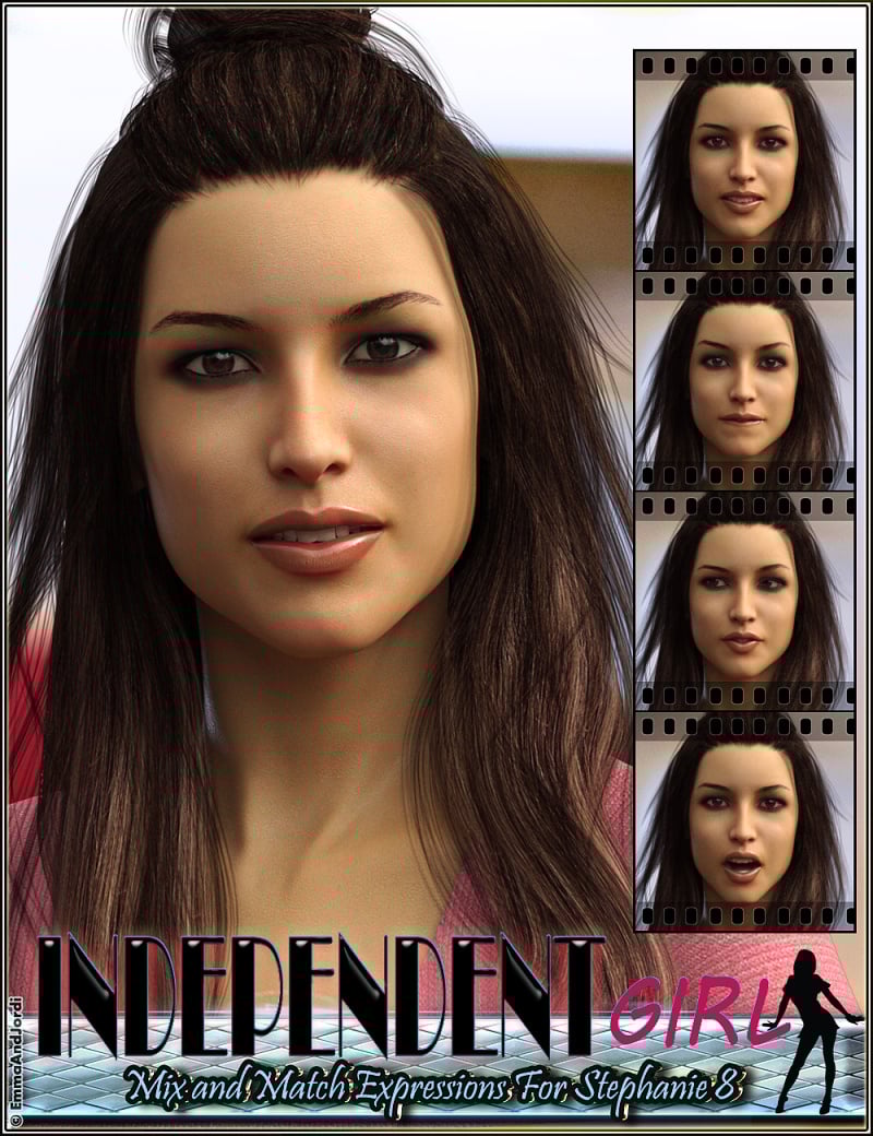 Independent Girl is a pack of expressions organized in three folders (Full Face, Upper Face, and Lower Face) for Stephanie 8, and you also have pose control ERC dials to apply each full face expression. So you can add expressivenes in three ways: USING FULL AND PARTIAL EXPRESIONS: Using the partial expressions, you can move all the face, or just the upper and lower parts of the face, mixing both as you like, creating your own original expression for your renders. USING POSE CONTROL DIALS: Using the pose control dials, you can apply a full face expression as much as you like, and also mix it with another expression dial. It is great to create transitions between expressions in animations or series of renders. USING BOTH: In many cases you can also mix the partial expressions with the dials.