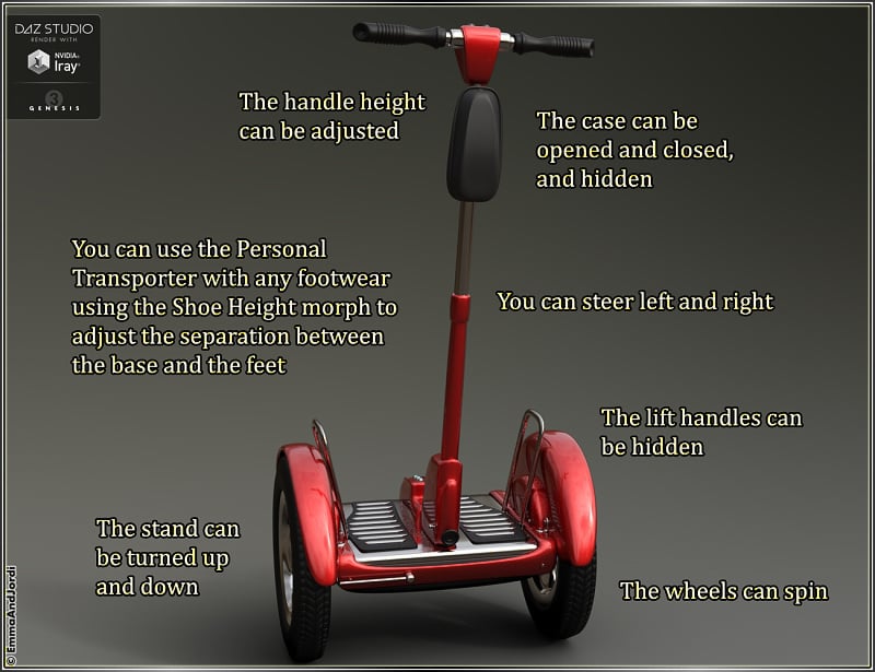 MORPHING FEATURES: EJ Personal Transporter has several moving pieces. You can put the stand up and down for when it is parked. The case (perfect for small objects, like a mobile, keys or wallet, can be opened and closed. The steer can be moved ten degrees left or right to turn when moving at full speed. The handle height can be set higher or lower. And of course the wheels can turn without limit in your animations. To help you to use the Transporter with any male or female footwear, heeled or not, we include a Shoe Height morph. This morph moves the base of the Personal Transporter. Because of this, you don't have to modify the poses or adapt the hands, you simply adjust this morph so the base touches the sole of your shoes, and that's all. See the video below.