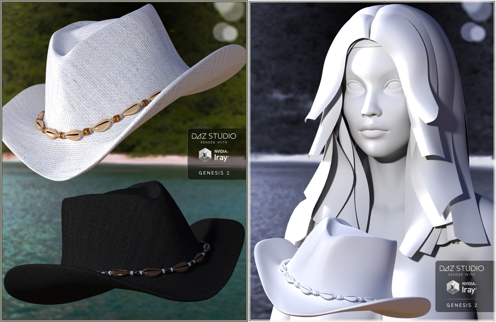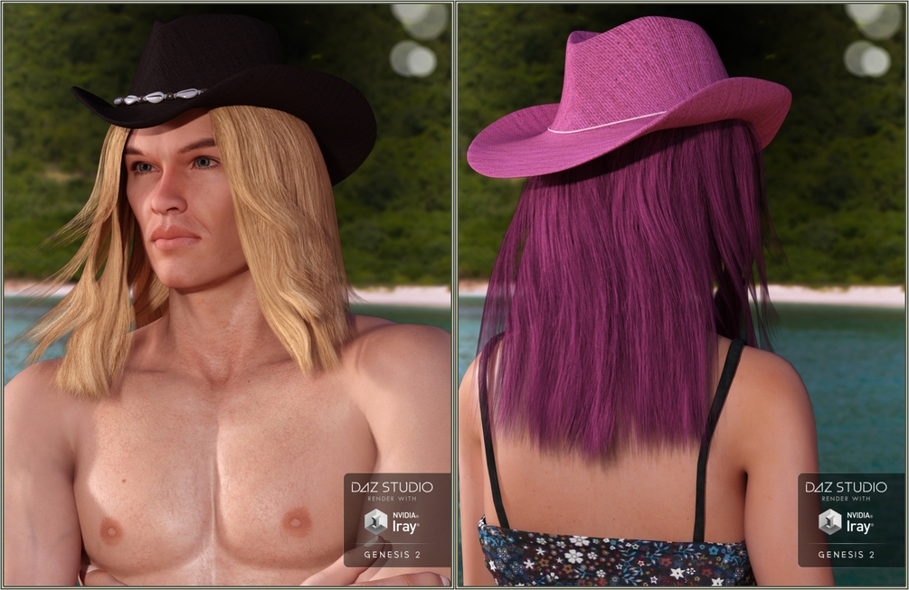 Buenaventura Hair includes 4 versions: 2 for Genesis 2 Female (with or without hat), and 2 for Genesis 2 Male (with or without hat), and also an unparented prop version of the hat. The hat is morphing, with 10 partial morphs that you can use to achieve different shapes, and you can also hide the hat string.