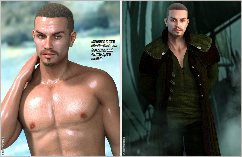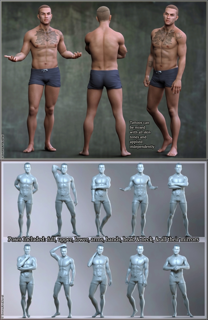 He has a custom morph for his head, and also extra body shape and detail morphs for his body, that can be turned on and off, and apply extra body mass and muscle and bone definition. Argos also has materials for 10 eye colors, two of them fantasy ones (in yellow and white, perfect for vampires or other dark/fantasy/sci-fi beings), 4 skin tones to make his skin pale, tanned, golden, or average. He also has tattoos for the chest and forearm, and wet or dry skin options for simulating sweat, humidity or water. All these possibilities can be mixed together, and can affect both Argos and his anatomical elements.