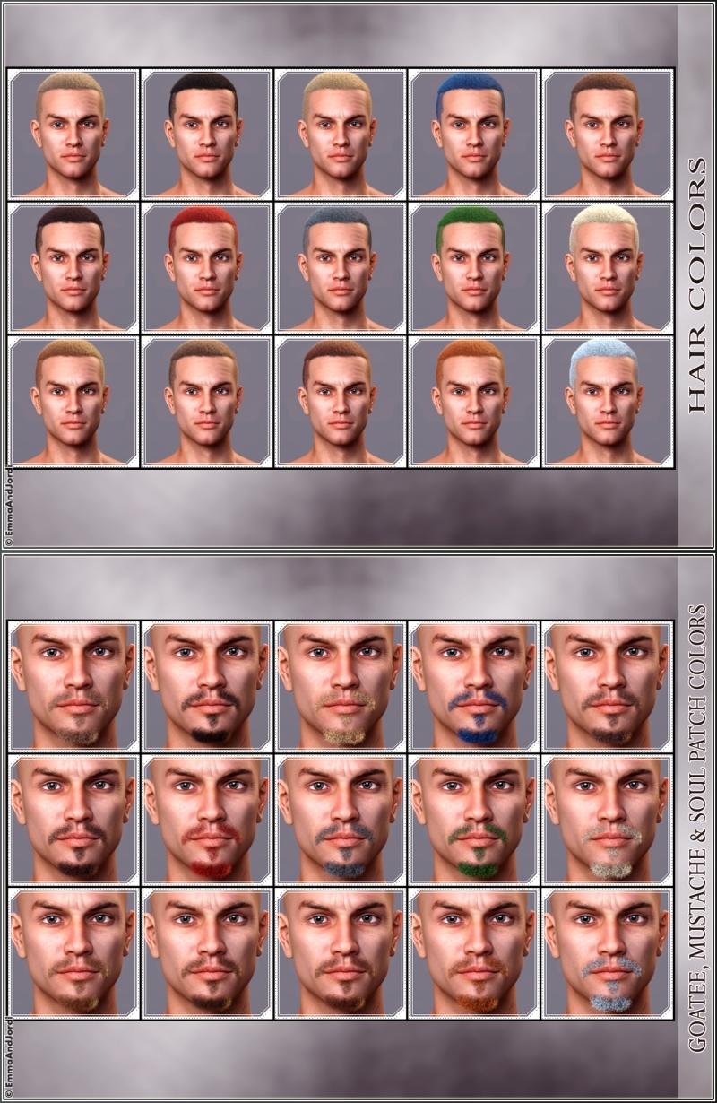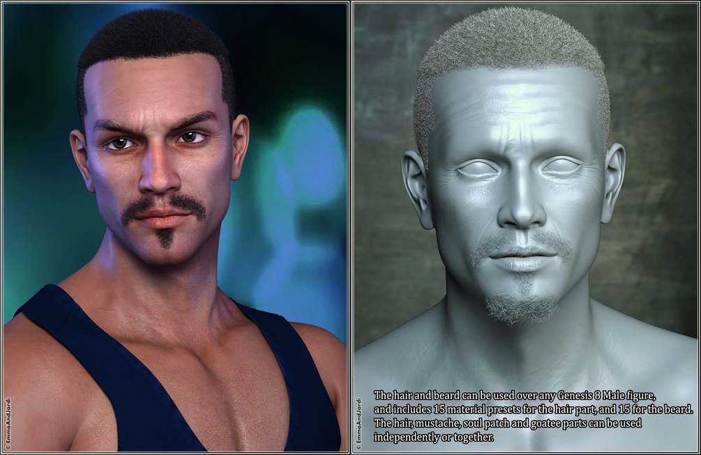 HAIR, MUSTACHE, GOATEE & SOUL PATCH The head and facial hair for EJ Argos is also included. There are several parts that can be used together or independently: goatee, mustache, hair, and soul patch. By using one or several of them, or them all at one time, you can get him look like different people, or the same person in different situations of his life. There are 15 material presets for the hair part, and 15 for the beard and mustache part, so you can style them even more.