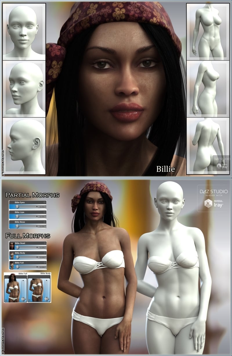EJ Ethnic Beauties For Genesis 8 Female(s) is a collection of 42 custom sculpted morphs that shape your Genesis 8 to reflect a beauty ideal of 7 ethnic groups: Billie (African), Indira (Indian), Yumiko (Asian), Juanita (Latin), Aunani (Polinesian), Chenoa (Native American), and Celine (Caucasian). You can morph the full figure, or only the head or body, or mix and match the lips, eyes, and nose of each ethnics with the others to get unique looks, or create mixed ethnic characters.