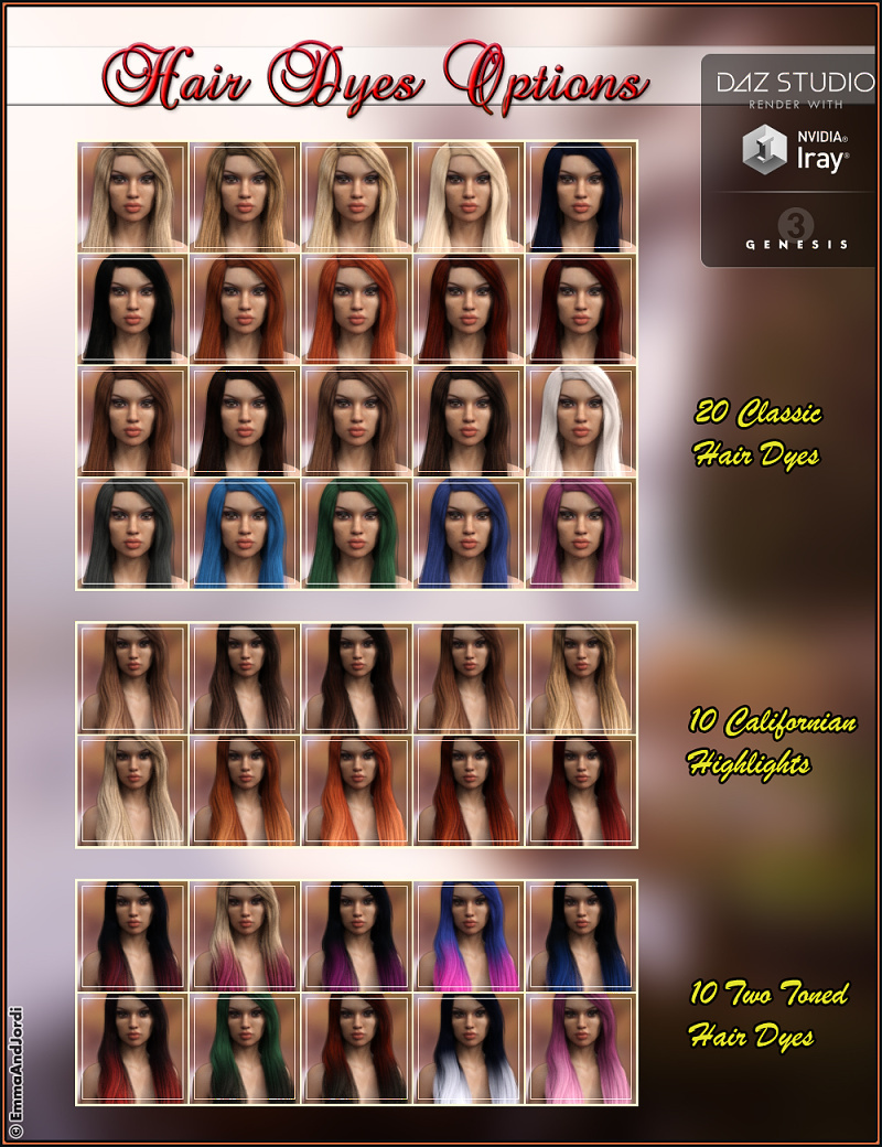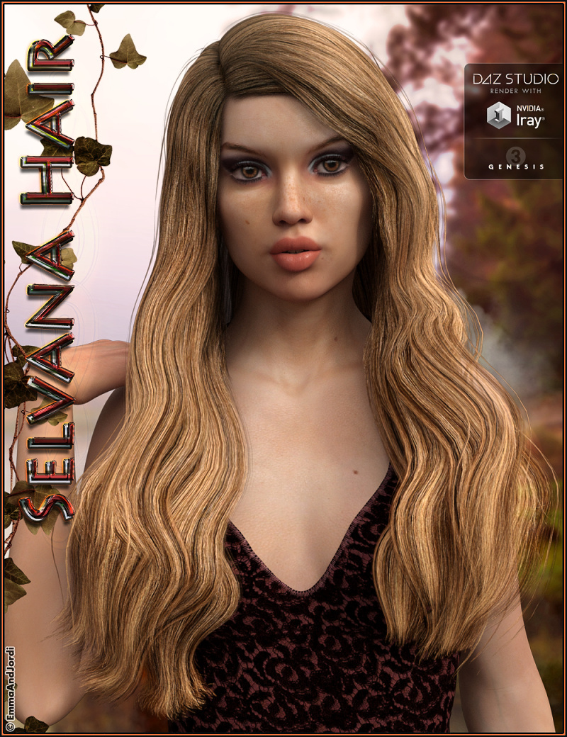 Selvana Hair is a very versatile long hair with lots of morphs that allow you to create different looks, from straight to wavy. Includes 124 morphs to make it wavy or messy, move it with wind, use with elven ears, and more, and 20 Classic Hair Dyes, 10 Californian Highlights, and 10 Two Toned Hair Dyes. Having so many movement morphs it can also be perfect for your animations. Using the many materials and morphs you can get the style that you need for any character for casual, fantasy, romantic, or sci-fi renders. A must have! Includes Iray materials to give the hair the quality you need for the new generation of NVIDIA Iray renders, in addition to the traditional 3Delight materials. There is plenty of materials to choose, from all the classic hair dyes to Californian highlights and two toned dyes, making possible to match the look of any character concept. Selvana Hair also includes 124 custom morphs, in these 20 categories: All Back, Back Adjust, Bangs, Chest Adjust, Ears Adjust, Elven Ears, Face Adjust, Hairline, Head Adjust, Length, Mess, Move, Move Ends, Shoulders Adjust, Volume, Wavy, Widen, Wind Easy, Wind Partial, Windy. The hair is completely rigged even for the ears, so you can pose freely without any needed adjustment, but if you need it you have plenty of adjustement morphs. You can put it all back on one or both sides, make it wavy in the upper part or in the lower part and in the side you want, use it with any elven ears, mess it, make it longer or a bit shorter, move it in all directions all or only the ends, give more volume, widen, and you also have 3 categories with wind morphs that move each part, or mess in a windy style, or make easy posed wind looks. Works with all the Genesis 3 Head and Body Morphs, as all of them have been included when needed, which means full freedom to use any of those morphs in your creations. In addition, we have adjusted the rigging features as much as possible, so it will also work great with custom head morph shapes. Selvana Hair is for Genesis 3 Female(s), including Victoria 7, Karen 7, Bethany 7, Teen Josie 7, Arabella 7, Olympia 7, and Eva 7. If you need some more adjustment, you have morphs for that too both for face and body.