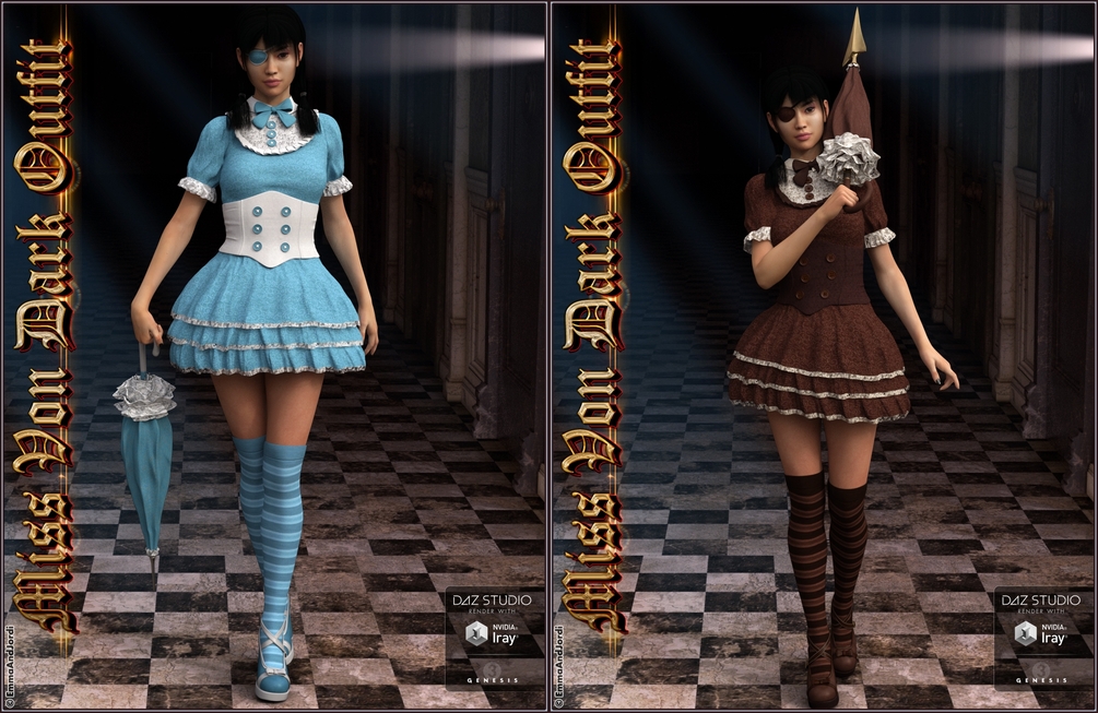 MATERIALS FEATURES: 8 Full sets for all the outfit that load with a single click, plus materials preset for each part, and hide options. Also, in the dress you can hide the bow, or the buttons, or the bib and the buttons, mix and match the different skirts, and the different waspies, thus getting a high degree of customization to make it look very different. In the footwear you can hide the shoe and leave the socks only (a feet pose to use them with the shoe hidden is provided), or hide the bows, or hide the socks leaving the shoe only, and hide also the strap under the bows, and you can also mix the colors of the socks and buckles with the shoe colors.The canopy of the umbrella can also be changed of color independently, and the most amazing is the points: you can choose between blade or spike, and the color in silver, gold, brass or copper, and the blade can have blood or not. And each piece has 8 material presets you can mix and match as you wish. Create endless combinations for a lot of situations!