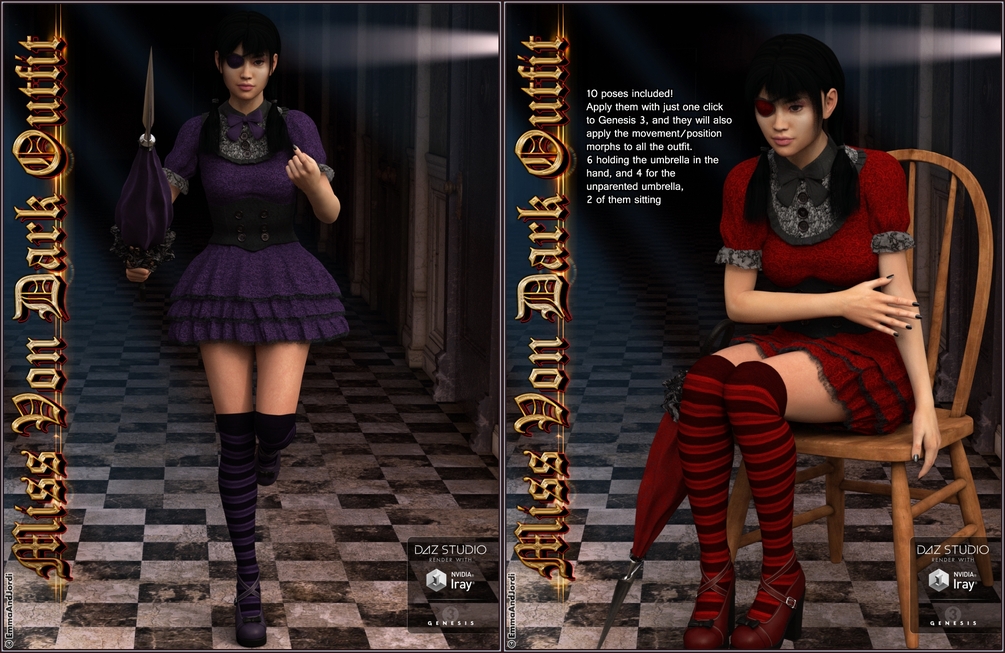 Miss Von Dark Outfit And Accessories is a complete set of Dress, Shoes with Socks, Eyepatch, and Blade or Spike Umbrella, unparented version of the umbrella, and 10 poses for Genesis 3 Female(s).