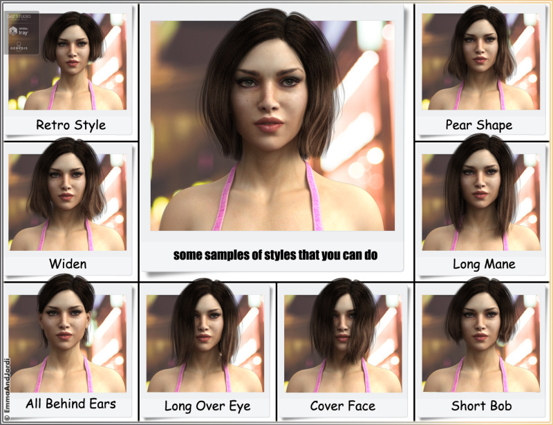 COMPATIBILITY FEATURES: Works with all the Genesis 8 Head and Body Morphs, as all of them have been included when needed, which means full freedom to use any of those morphs in your creations. In addition, we have adjusted the rigging features as much as possible, so it will also work great with custom head morph shapes. This hair is for Genesis 8 Female(s), including Victoria 8, Olympia 8, Teen Josie 8 and Stephanie 8. If you need some more adjustment, you have morphs for that too both for face and body.