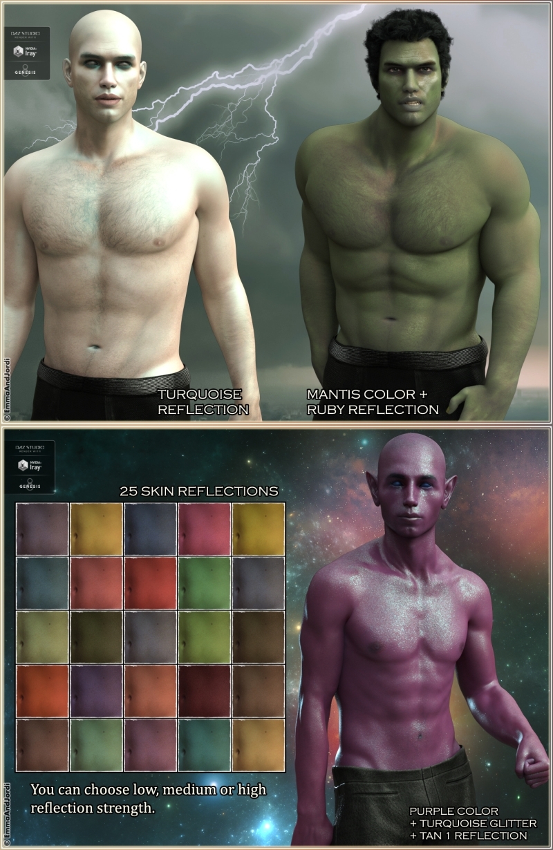 EJ Universal FX Shaders For Genesis 8 Female(s) and Male(s) is a set of 25 Skin Colors + 25 Skin Relections + 25 Glitter Options + 25 Nail Colors + 25 Lashes Colors + 25 Special Eyes + 10 Full Presets for female and male characters, that can be applied over any character skin to add special features that you need for your renders. A must have for Genesis 8!