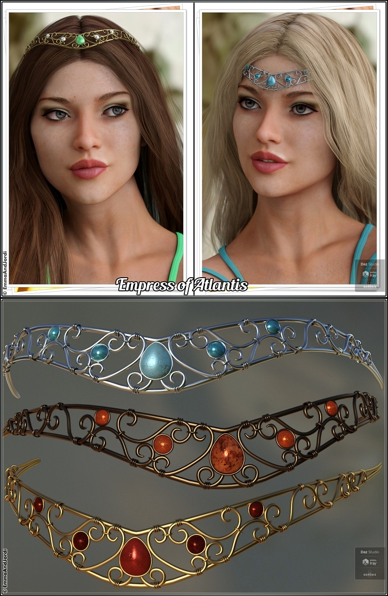 Each Tiara has different morphs to customize them. For example, in Antillia's Dancer you can move each one of the chains in every direction independently of the others, which gives you realism in posing, and you can also set the height size of the head part. It's also possible to hide each one of the chains independently, giving you many possible appearances for many renders. The many material presets change the different metal sets, and the jewels. In Empress of Atlantis, you can mix and match the metals of the swirls and the base of the tiara, and also hide the small jewels, and set the height size of the full tiara. The same happens with Heart of Avalon: you can chose the metal of the heart and the rest of the tiara independently, and also hide the pendant or make it smaller, and set the height size. In Lemuria's Crown the possibilities include setting the borders, the center, and the jewels, and using morphs that make the crown's height bigger or smaller, make the peaks more or less big, making the lower curves more or less curved, and change the crown shape making it lower and rounded or closer to the nose and more warrior-like. In Princess of Thule, you can hide the small jewels, leaving only the cental one, and set the jewels stone, and the metal of the tiara.
