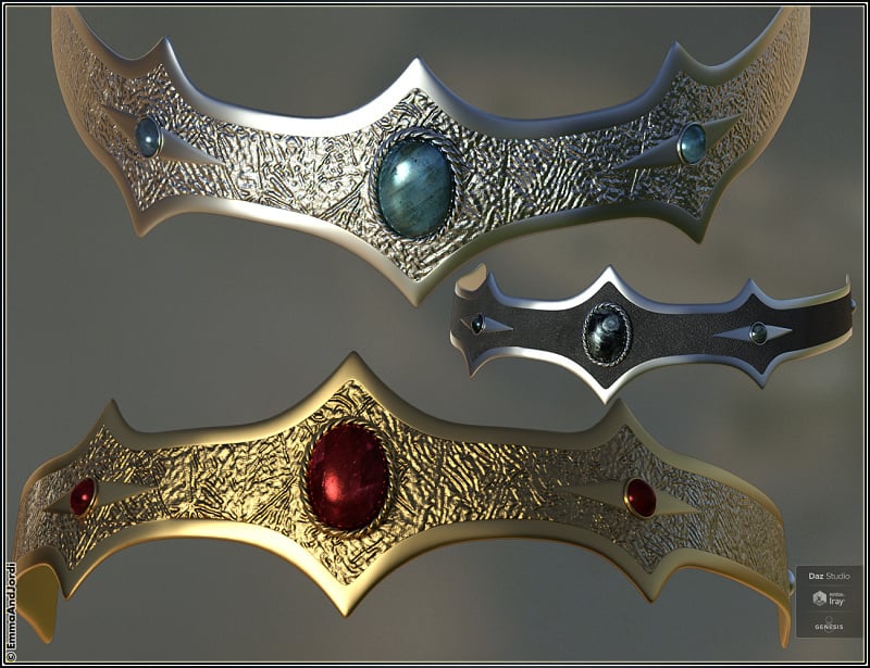 EJ Tiara Collection is a collection of 5 different kinds of head jewelry that can be used as tiaras, crowns, or circlets. Each one of them is inspired in lands of fantasy, and you can customize them with the many full material presets included, partial material presets for the different jewels and metals, and also options to hide some parts.