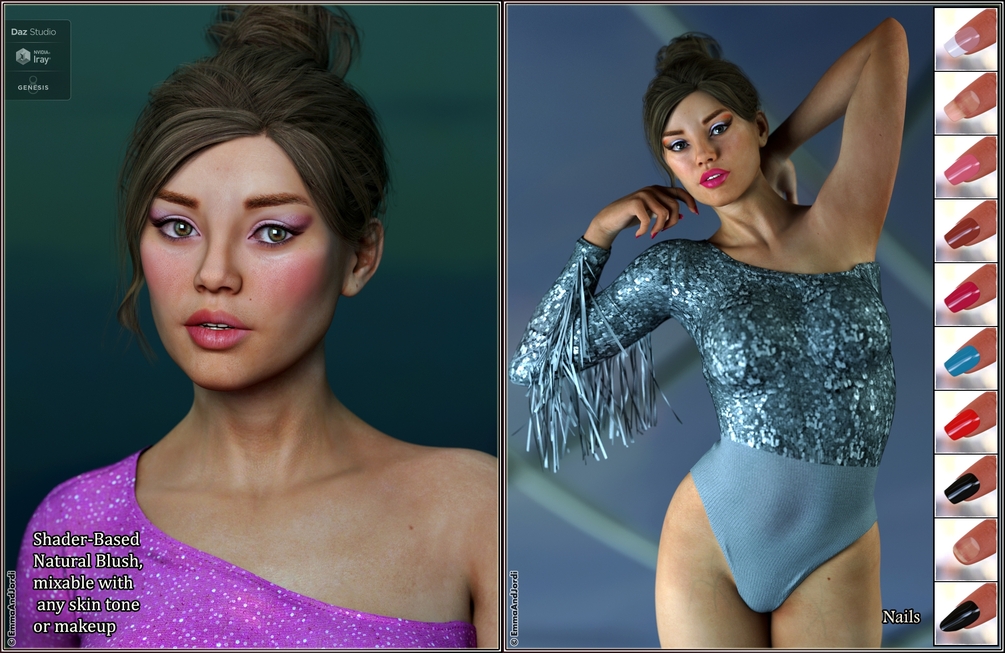 - BLUSH: She includes a shader-based natural blush, that can look great with any of the 10 included expressions. The blush can be applied or removed in any moment, and combined with any skin tone or makeup.