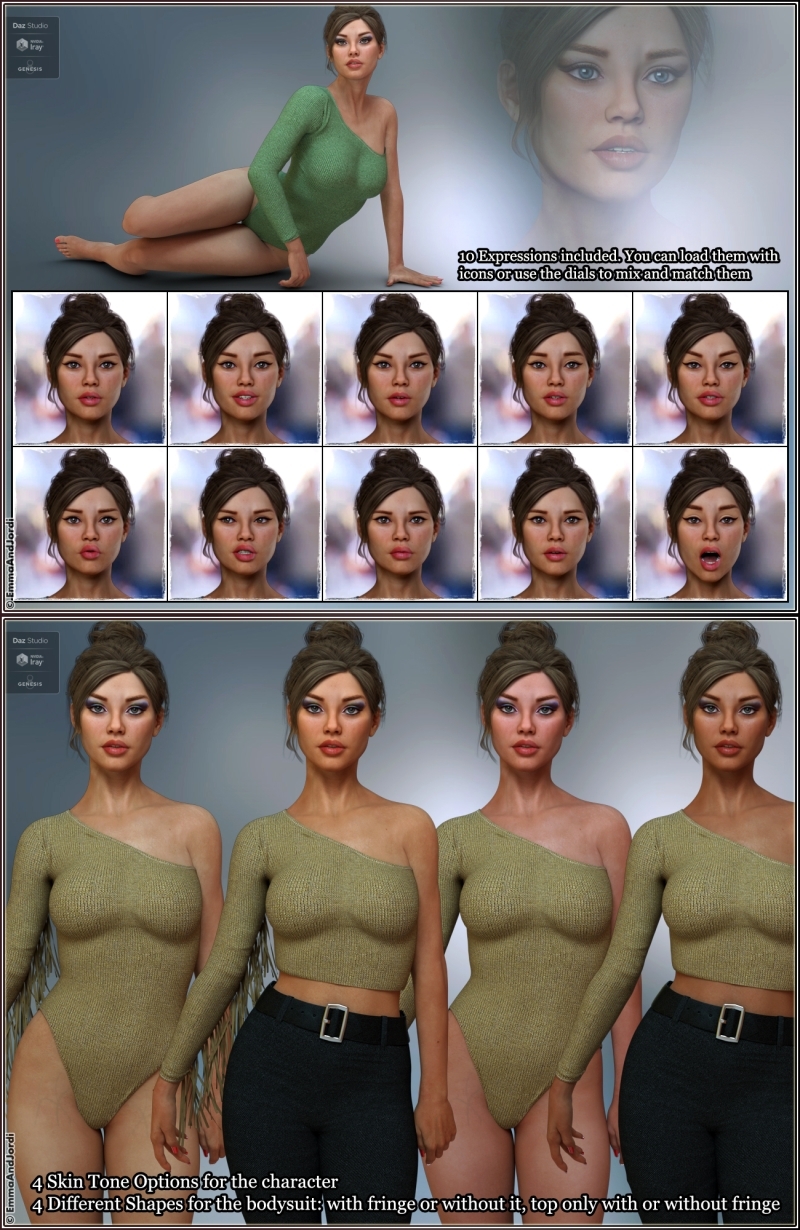 EJ Wendy Deluxe Pack includes a gorgeous and detailed character, a bodysuit that can be turned into a top, a dforce ready arm fringe, and 10 expressions to show her personality. It's a complete ready-to-render must have set, that can be used to make new scenes, and she will also look great with any clothing and in every situation.