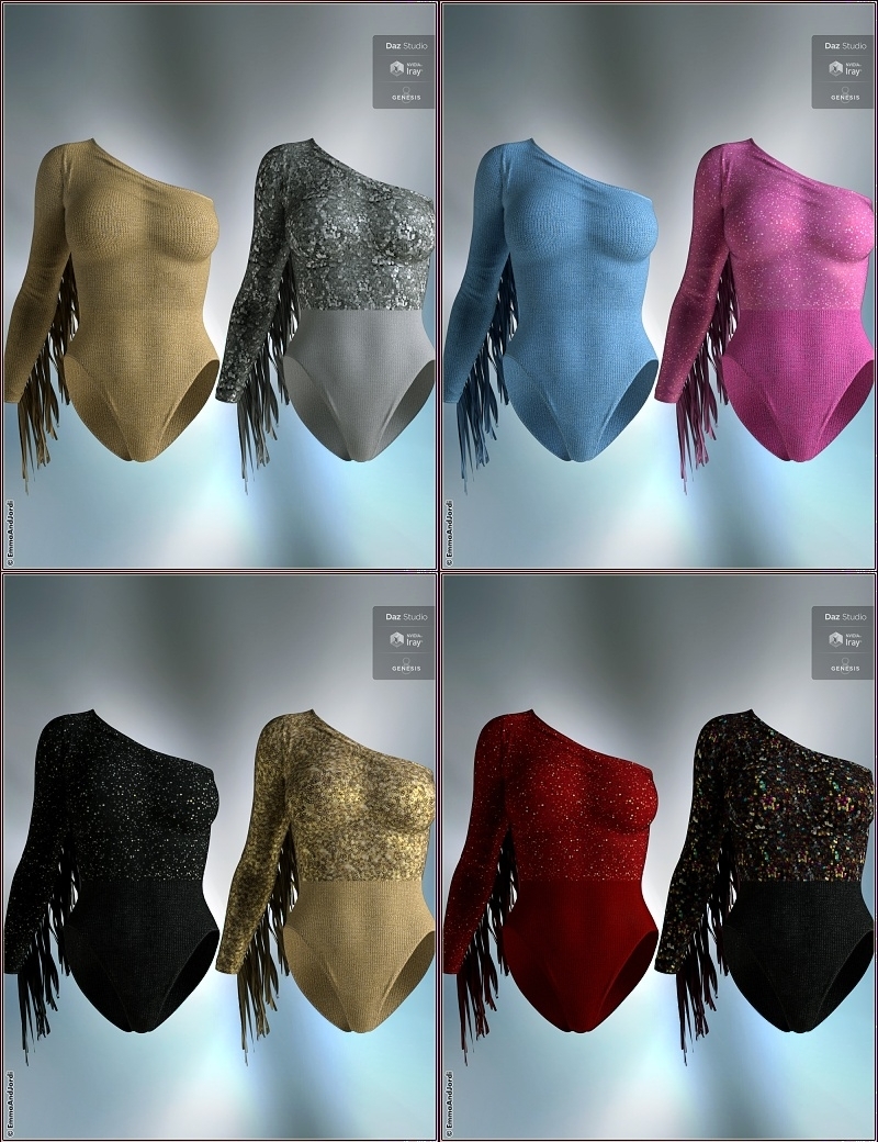 - MULTI-LOOKS BODYSUIT: The bodysuit has 4 possible shapes: with arm fringe, without arm fringe, turned into a top with arm fringe, or top without arm fringe. There are also 10 full material presets, and 10 partial materials for the bodysuit and 10 for the fringe. Mix and match all these to achieve lots of different looks! The arm fringe is prepared for dforce so you just have to pose and click the simulation button. Also, there are 2 pre baked simulation morphs that may work for many standing poses in case that for some reason you don't want to use dforce or just want to pose it quickly (although the simulation runs very fast). The clothing includes style morphs to make the front or bottom part back narrower or wider, and also to make the chest fuller, or lower the back part. All has been rigged to follow poses in almost all possible situations automatically, including sitting or lying on the ground.