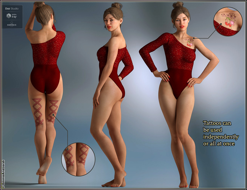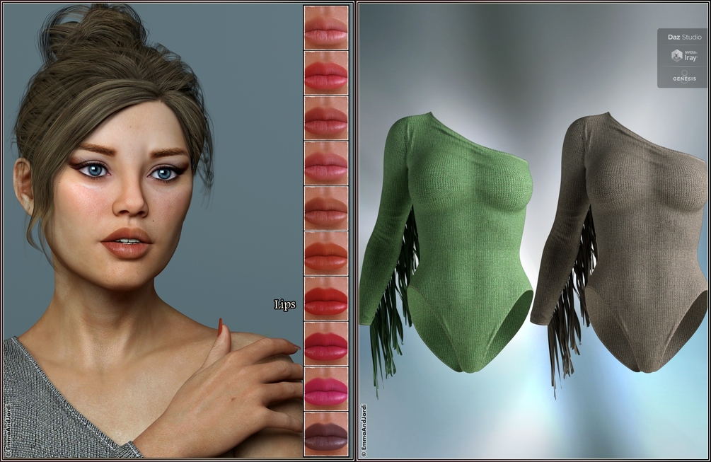 - MAKEUPS AND TATTOOS: She has varied makeup, nails (that look great with her two custom sculpted long nail morphs), and lip options, so you can depict her in very different ways, to look like very different women. If you want tattoos, she has them in her chest-shoulder, and in the back part of the thighs, and they can be used independently or all together.