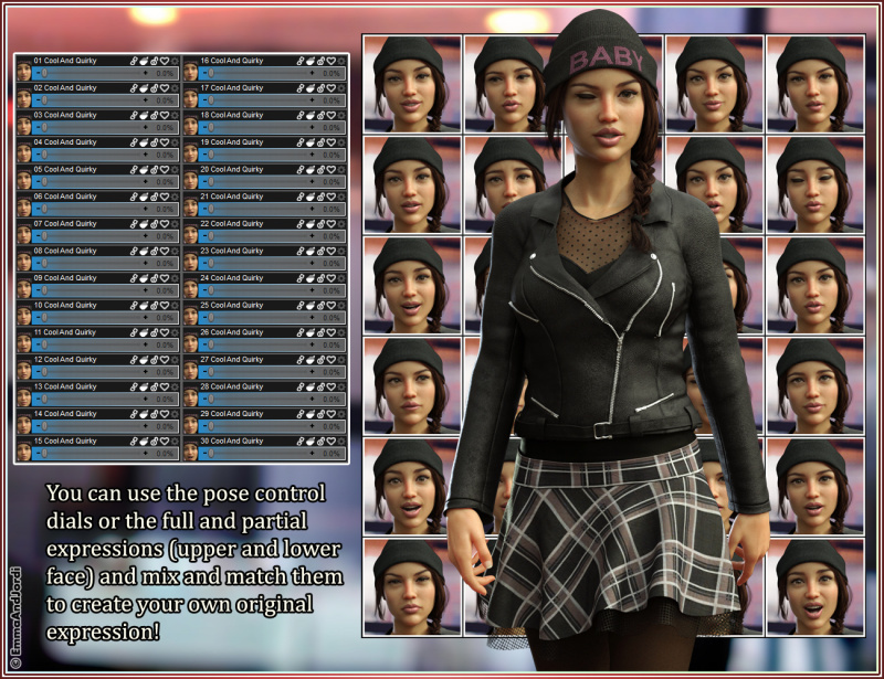 Cool And Quirky is a must have expression pack for Charlotte 8 and Genesis 8 Female(s), that consists in expressions organized in three folders (Full Face, Upper Face, and Lower Face), and you also have pose control ERC dials to apply each full face expression. So you can add expressivenes in three ways: USING FULL AND PARTIAL EXPRESIONS: Using the partial expressions, you can move all the face, or just the upper and lower parts of the face, mixing both as you like, creating your own original expression for your renders. USING POSE CONTROL DIALS: Using the pose control dials, you can apply a full face expression as much as you like, and also mix it with another expression dial. It is great to create transitions between expressions in animations or series of renders. USING BOTH: In many cases you can also mix the partial expressions with the dials.