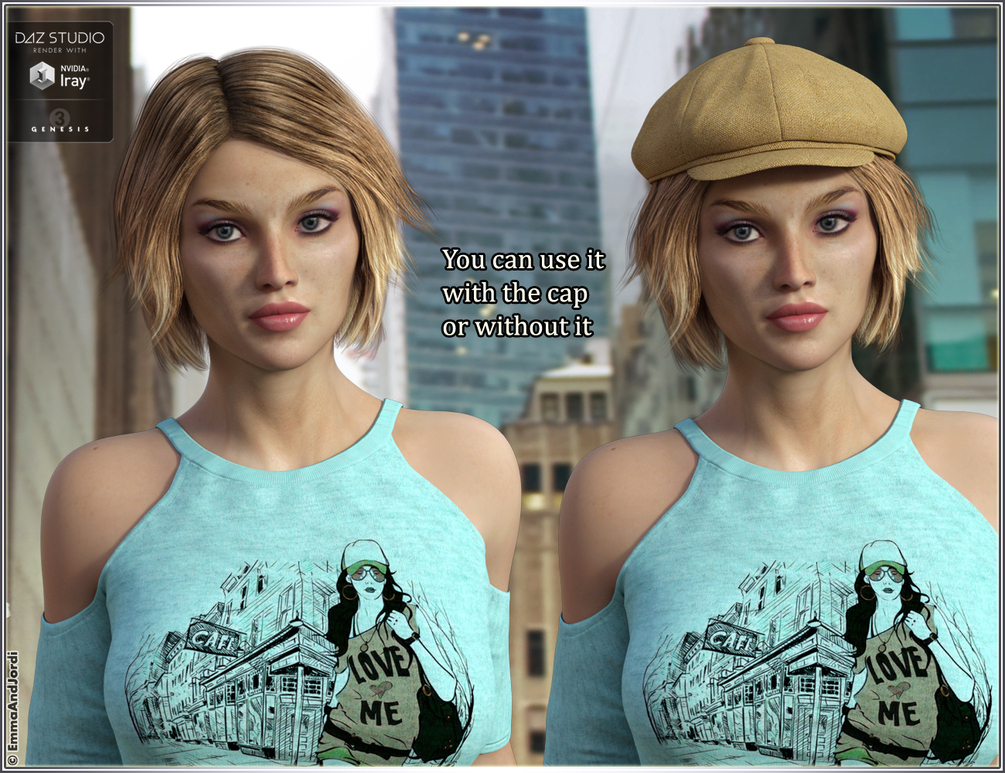 Manhattan Hair And Newsboy Cap for Genesis 3 Female(s) and Male(s), a short bob hair that can be used with its Newsboy Cap, or without the Cap, giving you a very versatile short/medium hairstyle perfect for lots of situations, and a fashionable hairstyle with an urban and sophisticated cap that can look great in many characters. Also includes many hair dyes for the hair and fabrics for the Newsboy Cap, and a prop version of this same Cap to be used with other hairs or on bald characters. A must have!