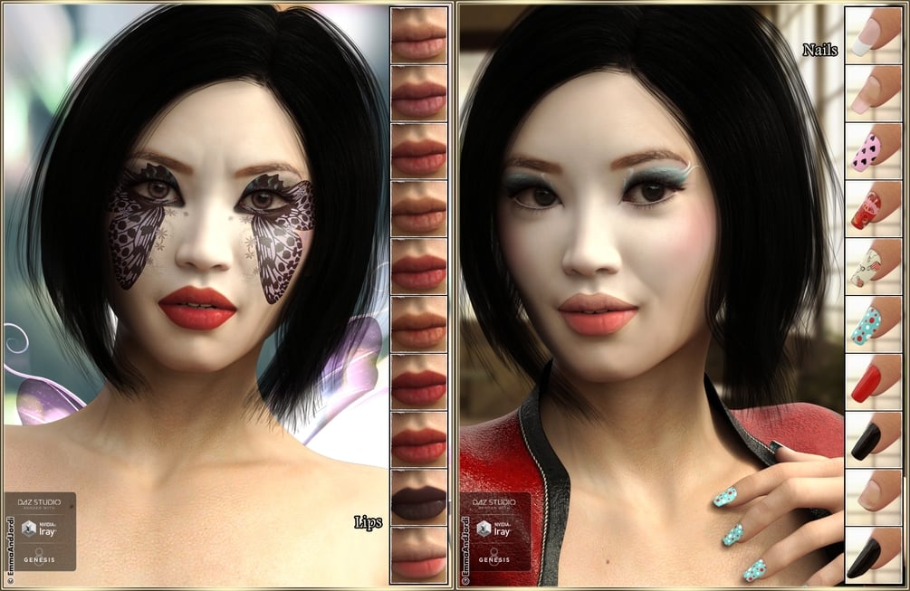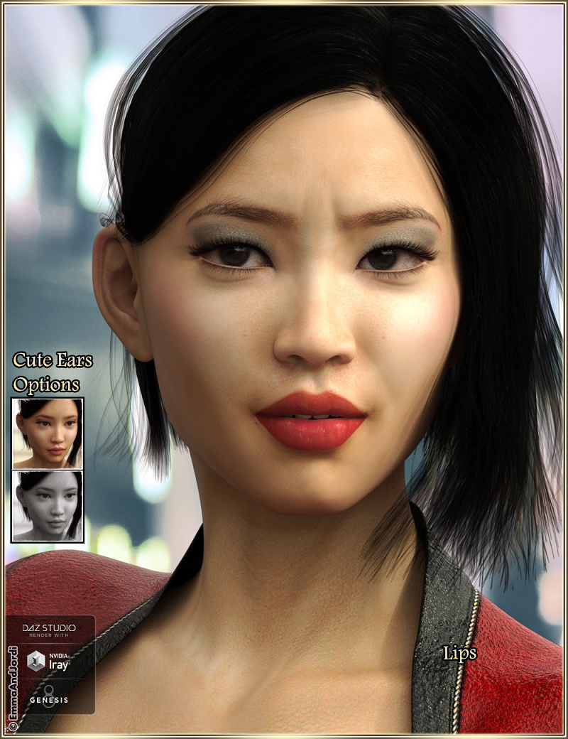 EJ Midori is a beautiful character for Genesis 8 Female that includes 4 skin tones, fantasy makeups, nail art, tattoos, cute ears, nails morphs, and casual makeups and lips. You can customize her fully and match the skin tone of people from different countries, and she will look great in many themes from casual, to action, fantasy or sci-fi. To show Midori as a living character, we also included 10 subtle expressions in this product, that you can use in your images to reflect his personality.