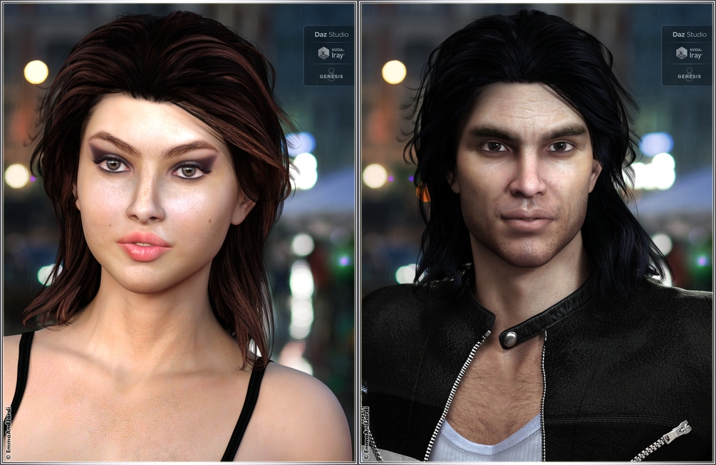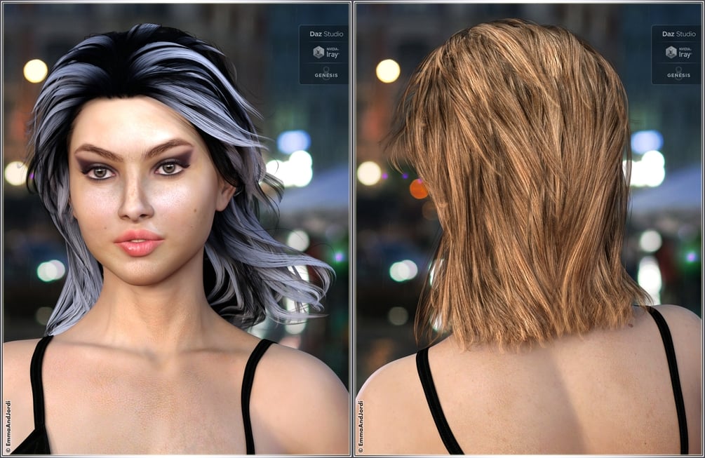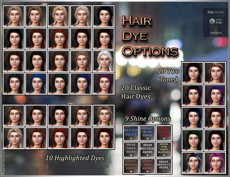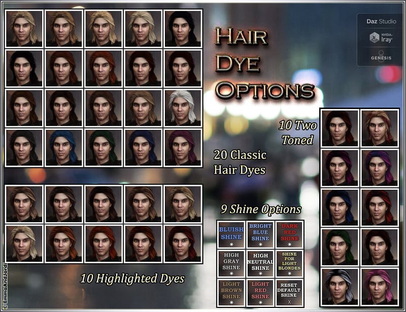 MATERIAL FEATURES: There are 20 Classic hair dyes that go from natural colors to fashionable colored dyes, 10 sophisticated Two Toned dyes, and 10 Highlighted Dyes, making possible to match the look of any character concept. In addition this hair includes 9 Shine Options for Iray, that can modify the quantity and color of the hair shine, and combined with the dyes can give you lots of different finishes. Includes Iray materials to give the hair the quality you need for the new generation of NVIDIA Iray renders, in addition to the traditional 3Delight materials.