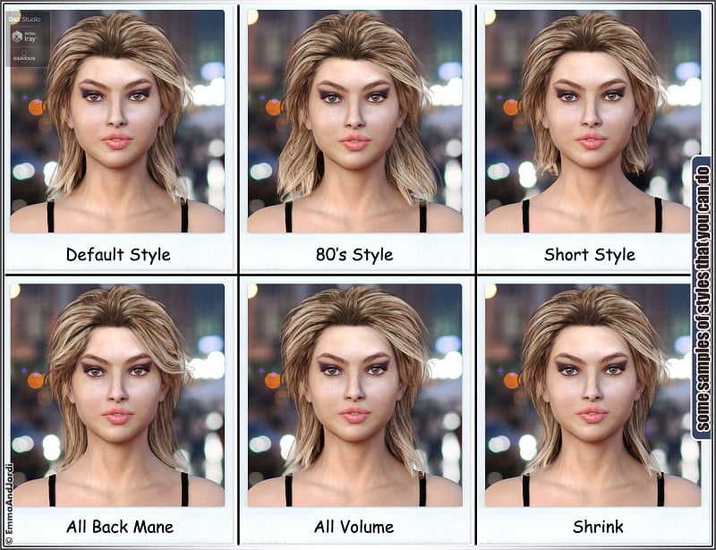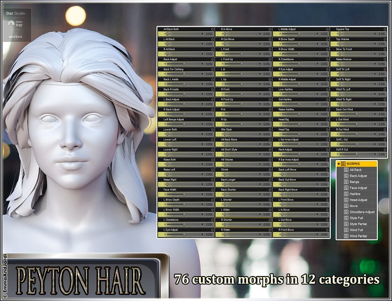 MORPHING FEATURES: The hair also includes 75 custom morphs, in these 12 categories: All Back, Back Adjust, Bangs, Face Adjust, Hairline, Head Adjust, Move, Shoulders Adjust, Style Full, Style Partial, Wind Full and Wind Partial. With them you can put it all back in one or both sides, move it with wind in all directions in several ways, set the hairline higher or lower, set the bangs higher or lower, move in all directions, style it as you like in each part or apply one of the 5 pre made style dials, and more.