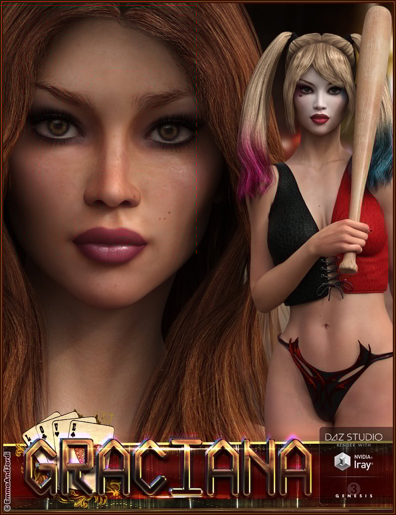 Graciana can be a stunning beauty, and also a crazy antiheroine that is capable of everything, having even supernatural features like pointed teeth and white or red eyes. For those who want to explore her dark harlequin side, there is 4 full face special makeups based on the classic poker cards, stiletto nails, and the mentioned pointed teeth and preternatural eyes. And for those who just want a beauty, matching casual makeups, nail colors and lip colors, tattoos including a very appealing finger tattoo, and the two custom nail morphs, and a beautiful face and body. A must have!