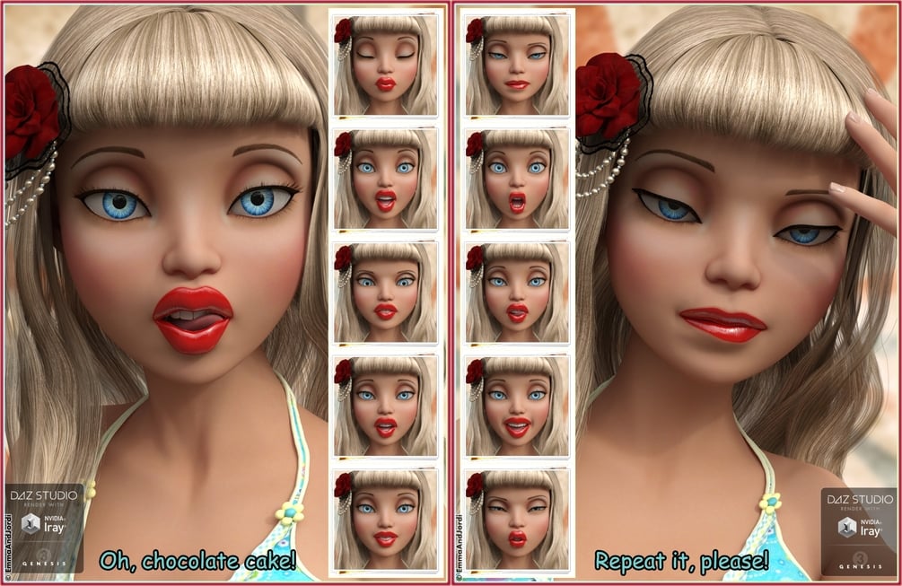Don't let your characters have a poker face! Bring them to life! A versatile customizable expression set for Genesis 3 Female(s) and The Girl 7! Make them happy, angry, joyful, bored, excited, sad, surprised... make your characters feel, make them tell a unique story. A must have! "Oh So Divine" adds the degree of realism in expresions that you need for the new generation of Iray renders. Every detail in the face has been adjusted to make your characters look real and alive. Oh So Divine is a pack of expressions organized in three folders (Full Face, Upper Face, and Lower Face) for The Girl 7 And Genesis 3 Female(s). With them, you can apply an expression that moves all the face, or partial expressions that move only the upper or lower parts of the face. You can apply a full face expression, or make your own mixing the upper and lower face partials. This gives you more possibilities: change your idea on the go, leave the lips that you like and choose different eyes for the expression, use the parts of the expressions that you like more, or even choose similar partials to subtly change the mouth or eyes in an animation, just like what happens in real life. Natural expressions for real faces, with subtle asymmetries to enhance realism. Good taste expressions, no grimaces. Although they were made especially for The Girl 7, they also work on Genesis 3 Female(s), and figures or characters based on her.