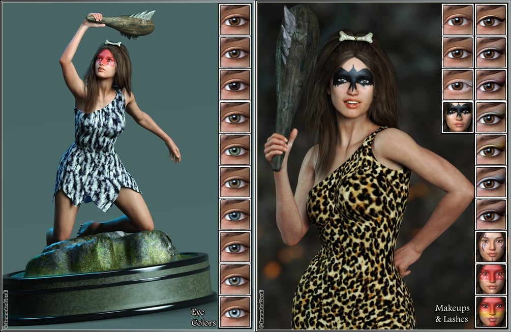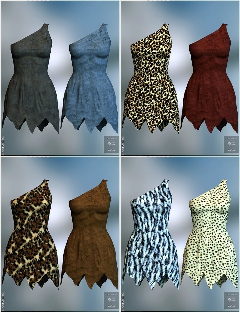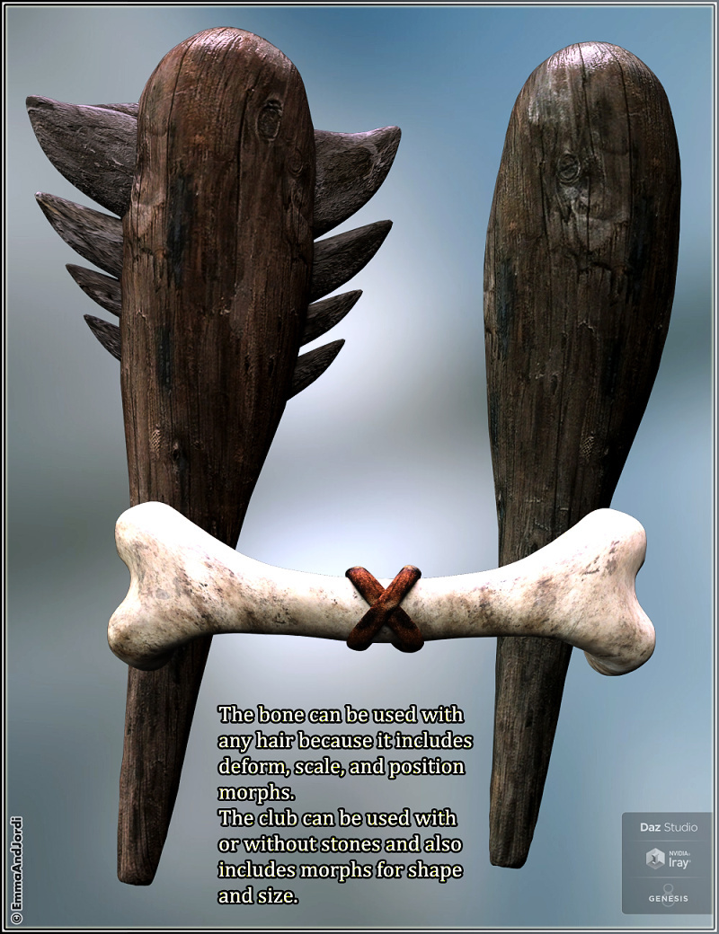 - CAVEWOMAN OUTFIT: The cavewoman outfit includes a leather dress (that supports dforce too), a spear of wood and stone, and a bone for the hair. You can hide the stones in the spear and the ties in the bone. Each piece has 8 matching materials, that you can mix with the others as you wish. The spear has morphs to make it longer, shorter, thinner or thicker, and to rotate it in the hand. The bone can be adapted to any hair, as it includes morphs to make it bigger or smaller, bend it, move it, rotate it, and more, so you can fit it to the hair.
