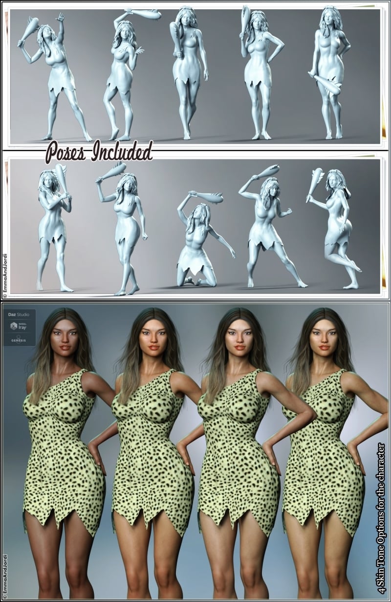 It's a complete ready-to-render must have set, that can be used to make new scenes, and she will also look great with any clothing and in every situation. Although she is depicted as a cavewoman, she can also be great for casual strong or athletic casual modern women, great barbarians, action women, post-apocalliptic, warriors, and all sci-fi and fantasy scenes.