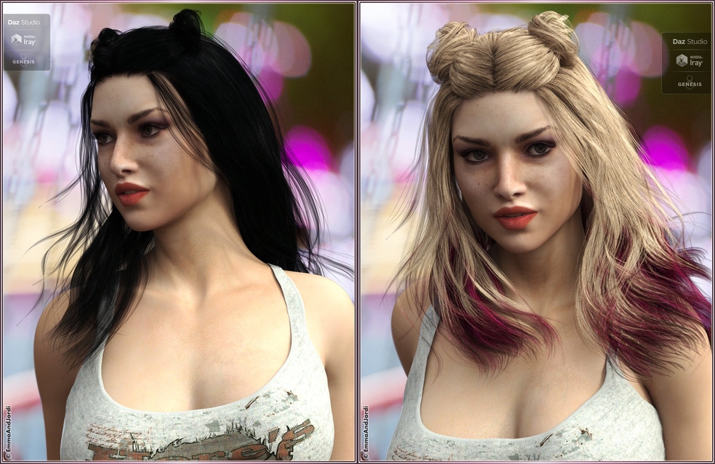 Candie Hair is a long space buns hair. It comes with style and movement morphs that allow you to shape the buns, blow it easily with wind, change its length, and many other things. The material presets included can dye it with a total of 42 different tones, from classic ones to sophisticated two tones.