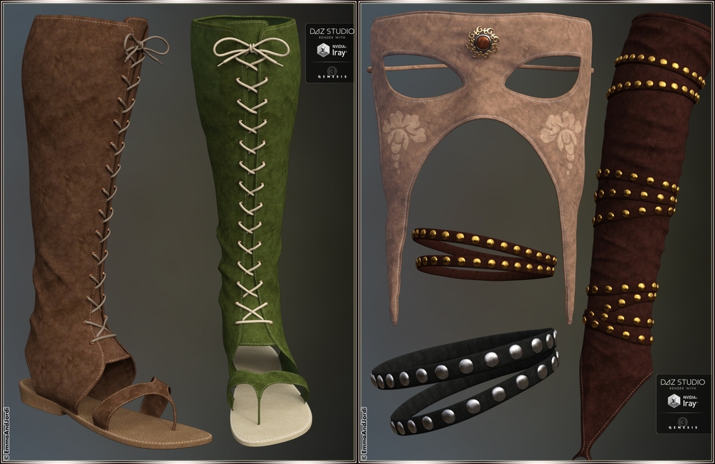 MATERIALS FEATURES: You can hide the studs in the Leg Straps, and in the Sleeve you can hide these and also the straps. In the Sword you can hide the pommel and the jewel. The frills of the Vambrace and Spaulder can also be hidden. The knot in the back of the bra of the Fantasy Outfit can be hidden too, and the jewel in the Mask. You can have the Sword clean or with blood. And each piece has 8 material presets you can mix and match as you wish independently. Of course there are full material presets to apply a set of materials to the full outfit. Create endless combinations for a lot of situations!