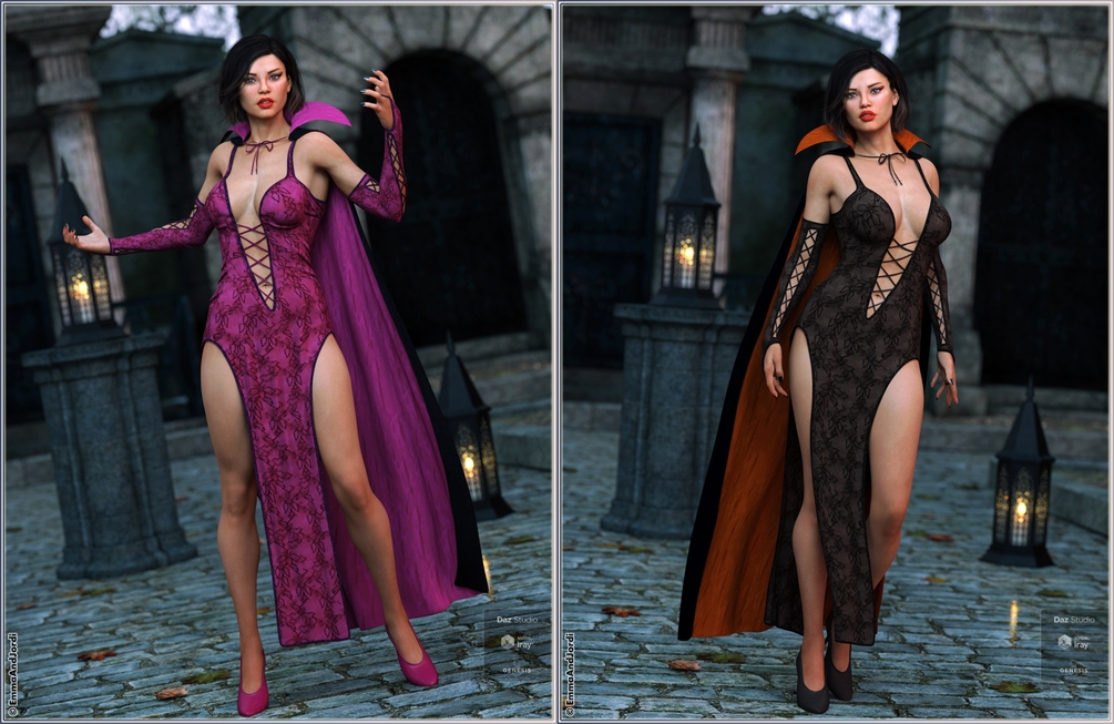 This outfit can be used for vampires and sorceresses as well as a night dress for many other themes, blood countess, or fantasy clothing, or glamour themes. A must have for your Genesis 8 Female!