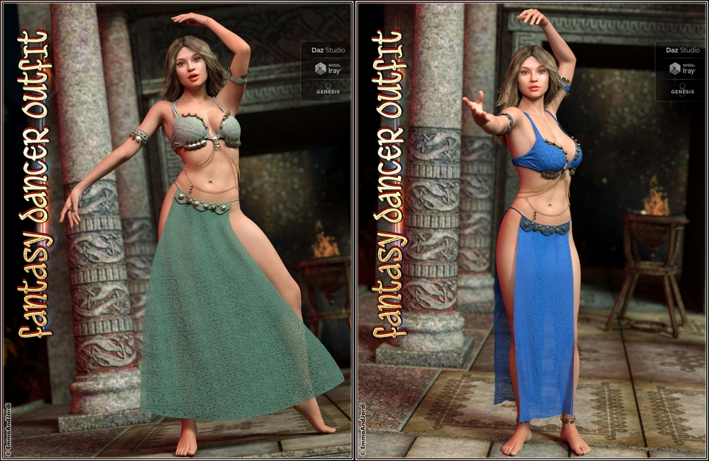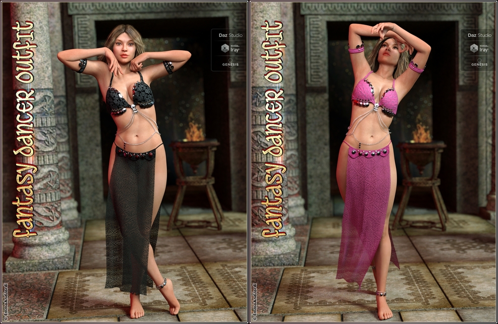 dForce Fantasy Dancer Outfit and Poses For Genesis 8 Female(s) is a complete outfit of several pieces (fantasykini, armbands, anklets, and skirt) that can be used independently, with 10 poses included, and many materials to choose for each part, including hide options, so you can customize it completely. This is a perfect outfit for fantasy dancers, exotic women, a sorceress, fantasy warrioress, and many other themes. A must have for your Genesis 8 Female!