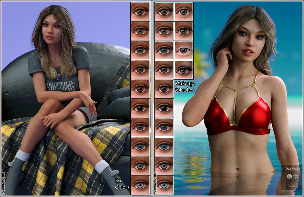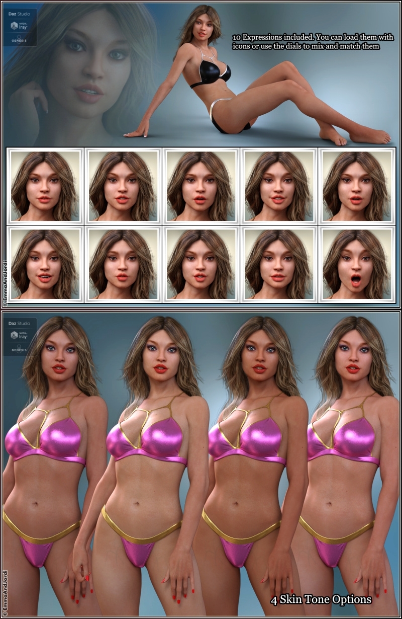 EJ Brenda Deluxe Pack includes a gorgeous and detailed character, a metallic shine bikini (you can hide the top or lower part or show it all), and 10 expressions to show her personality. It's a complete ready-to-render must have set, that can be used to make new scenes, and she will also look great with any clothing and in every situation.