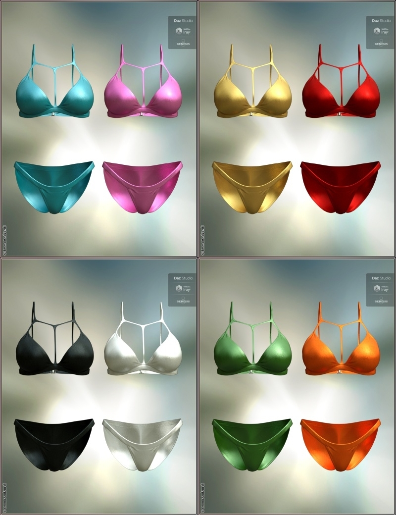 - BIKINI: This pack includes a metallic shine bikini with 8 different fabrics, both for Iray and 3Delight that you can use in lots of renders. There is a Hide Top and a Hide Bottom button in case you want to mix it with other clothing, or show only the top or lower part. The clothing includes style morphs to make the front or bottom part back narrower or wider, and also to show more or less cleavage in the top part. The clothing has been rigged to follow poses in almost all possible situations automatically, including sitting or lying on the ground.