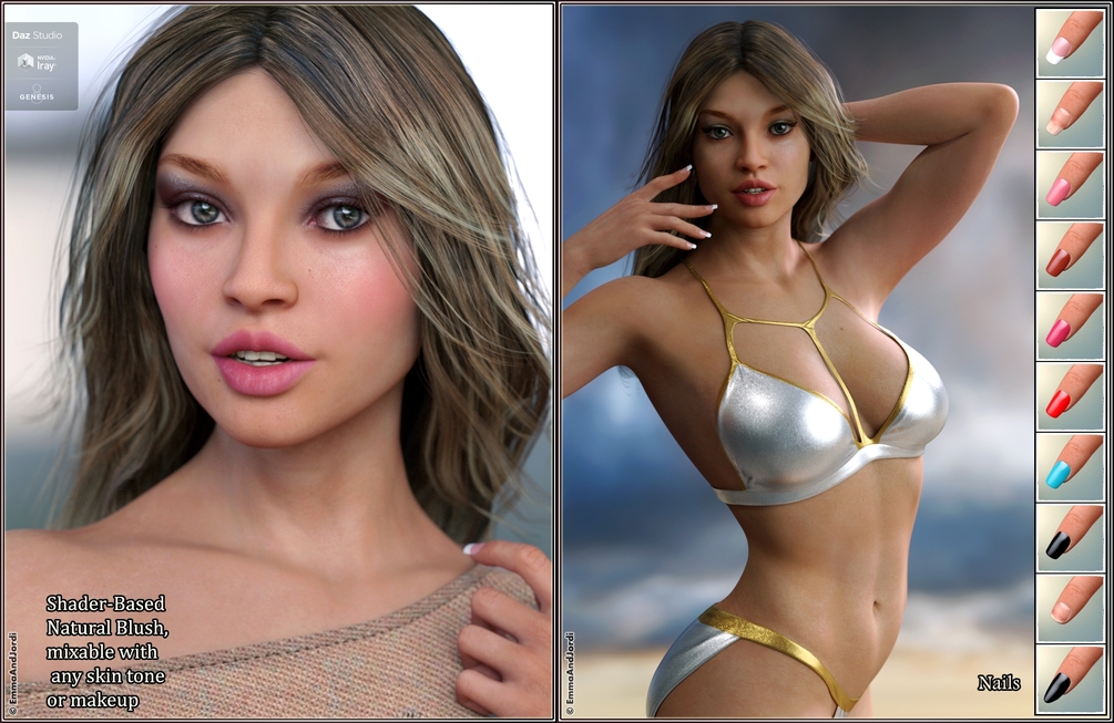 - BLUSH: She includes a shader-based natural blush, that can look great with any of the 10 included expressions. The blush can be applied or removed in any moment, and combined with any skin tone or makeup.