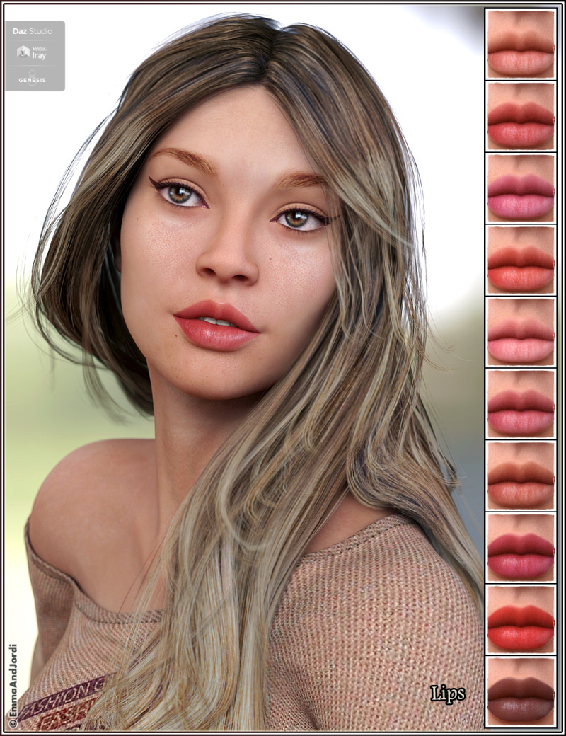 - MAKEUPS AND TATTOOS: She has varied makeup, nails (that look great with her two custom sculpted long nail morphs), and lip options, so you can depict her in very different ways, to look like very different women. If you want tattoos, she has them in her chest-shoulder, in the abdomen, and in the left arm, that can be used independently or all together.