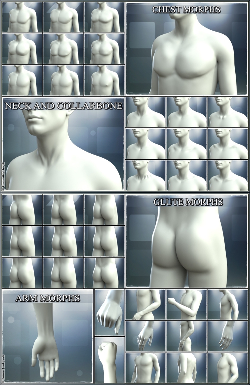 Made after a deep study of what physical features needed to be available as morphs, these morphs have the shapes that you've been missing like for example: finger knucles and tendons, collarbone and neck detail, male pectoral shapes, tendons that appear when you flex the hand, the back of kneebone, or the elbows inner and outer parts, muscles of the back, typical male shoulder shapes, belly, ribcage shapes, arms, and torso, and many other features that turn a 3d character into a living man.