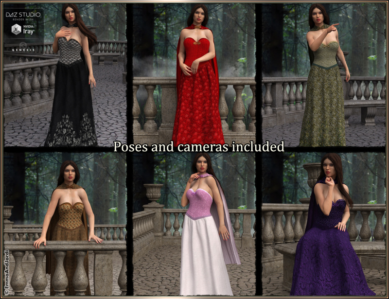MATERIALS FEATURES: You have 8 full material presets for all the outfit, and also 8 material presets for the dress, 8 for the cloak, and also partials to change the fabrics of the top, belt and skirt parts independently so you can make any combination you like. You also have hide options to hide the jewel of the top, the cloak's clasp, even hide all the top to use the skirt independently, or hide the skirt and use the top combined with other clothing. There are morphs to adapt the skirt or top to adjust them if needed. The metal of the jewel and clasp of each piece can be chosen between 8 different metal materials too. Create endless combinations for a lot of situations!