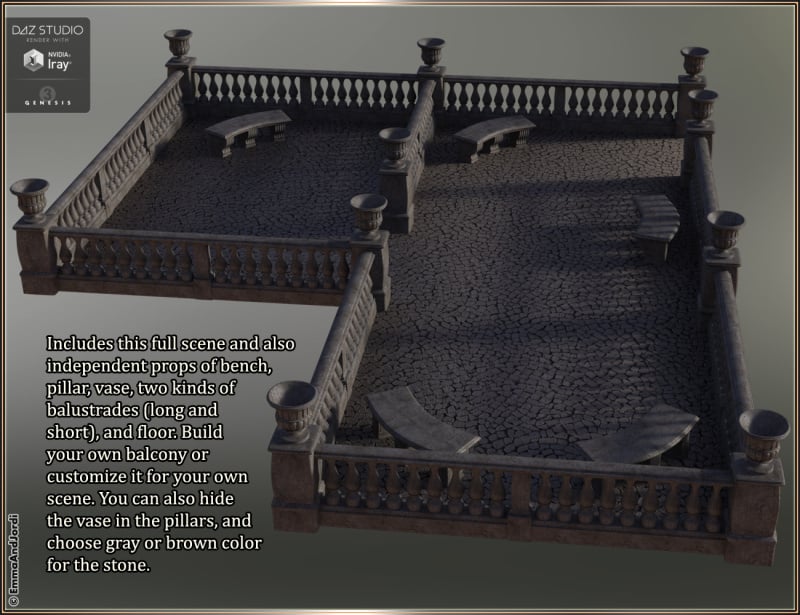 Violin and Bow automatically load as smartprops posed for Genesis 3 Female. You can also use one of the 6 Violin Player poses or take them as a starting point to make your own scene, and also choose between 3 of the most typical woods for the violin and bow. The full Balcony scene loads a complete scene at once and you can use the 6 included poses and cameras to quickly make great renders. In addition, you can use the independent scene pieces to make any balustrade, balcony, garden or palace render, as they are prepared to be combined and build new scenes.
